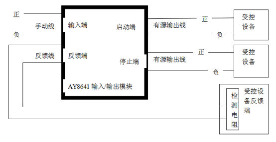 ·與消防聯動控製器(qì)中的手動控製(zhì)單元相連接,屬於二線製輸入輸(shū)出模塊,不需另接24V電源;具有二組有源輸(shū)出。能夠實(shí)現對外部設備的啟動、停止控製,同時能夠接收相應(yīng)反饋狀態,並將設備的動作狀(zhuàng)態傳送給(gěi)消(xiāo)防聯動(dòng)控(kòng)製(zhì)器。 能夠檢測模塊對外連接線的(de)通斷狀態。該(gāi)產品與本公司生產的各種型號消防聯動控製器配套使用。